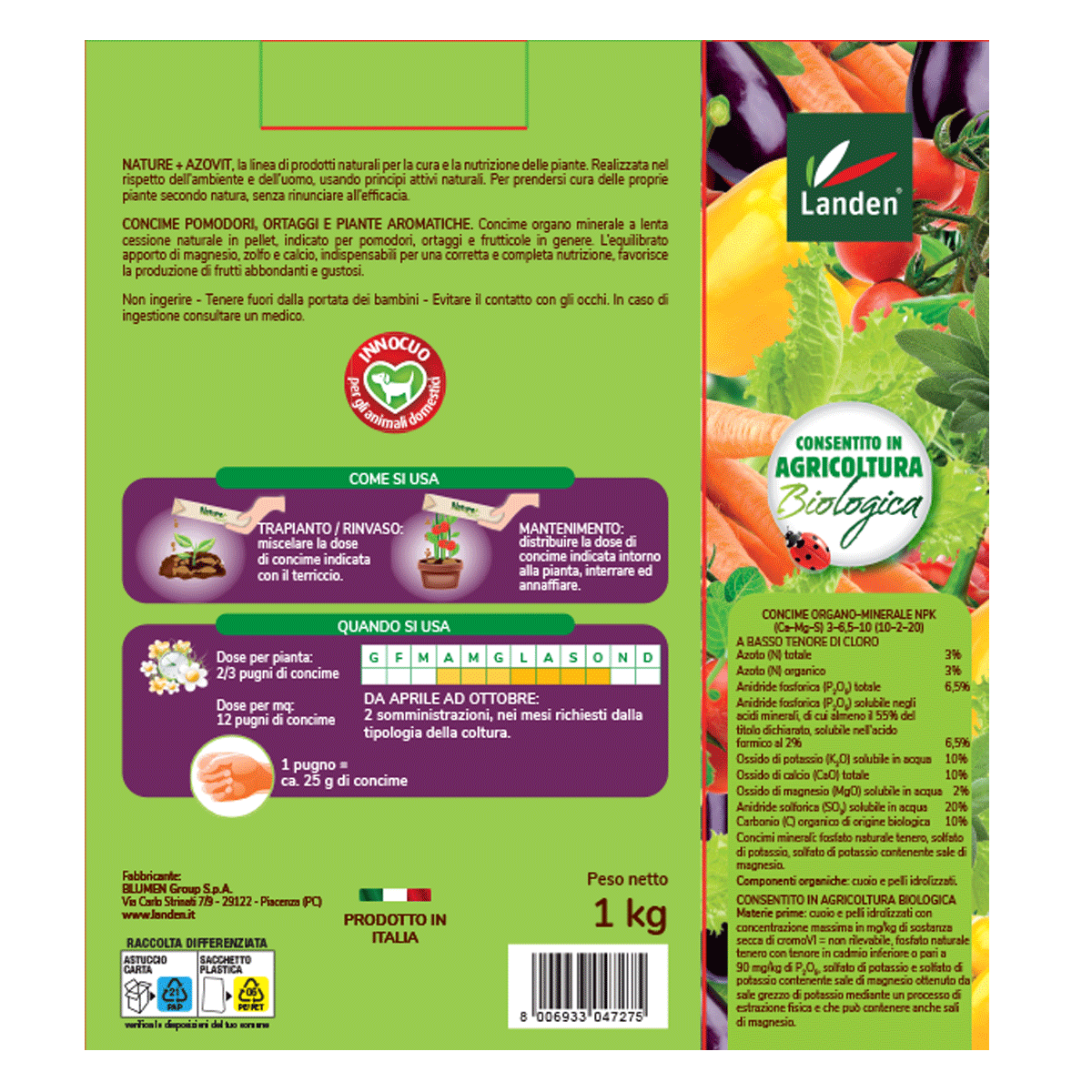 Concime organo minerale a lenta cessione in pellet, indicato per piante di pomodori, ortaggi e frutticole in genere. L’equilibrato apporto di magnesio, zolfo e micronutrienti, indispensabili per una equilibrata e corretta nutrizione, favorisce una produzione abbondante di frutti gustosi.
