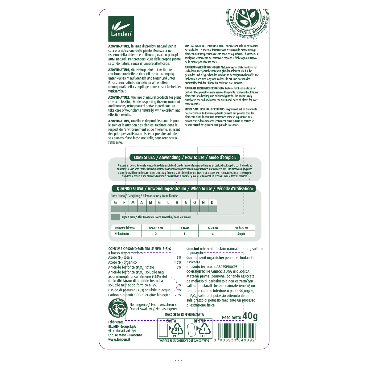 Concime in bastoncini per orchidee. La speciale formulazione contenente azoto organico assicura alle piante tutti gli elementi nutritivi per una crescita sana ed equilibrata. I bastoncini si sciolgono lentamente nel terreno e coprono il fabbisogno nutritivo per oltre 3 mesi.