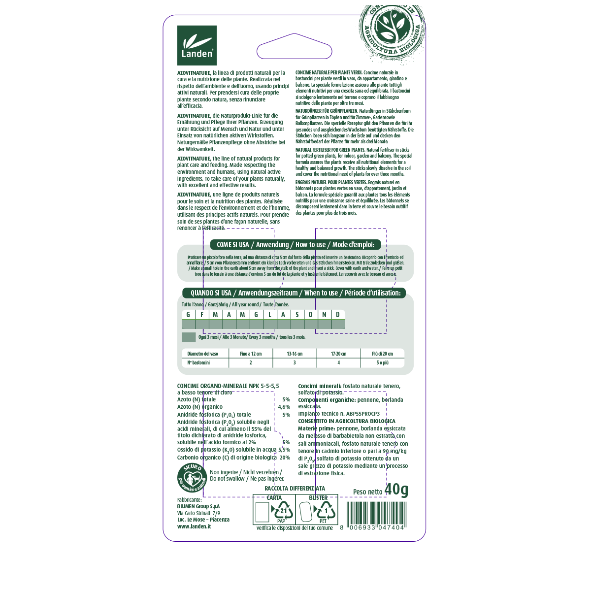 Concime in bastoncini per piante verdi, da appartamento, giardino e balcone. La speciale formulazione contenente azoto organico assicura alle piante tutti gli elementi nutritivi per una crescita sana ed equilibrata. I bastoncini si sciolgono lentamente nel terreno e coprono il fabbisogno nutritivo per oltre 3 mesi.