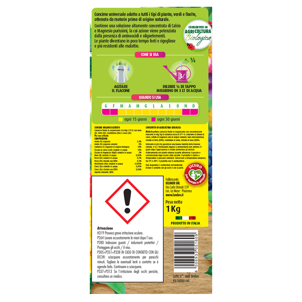 Concime universale adatto a tutti i tipi di piante, verdi e fiorite, ottenuto da materie prime di origine naturale. contiene una soluzione altamente concentrata di Calcio e Magnesio purissimi, la cui azione viene potenziata dalla presenza di aminoacidi e oligoelementi. Le piante diventano in poco tempo forti e rigogliose.
