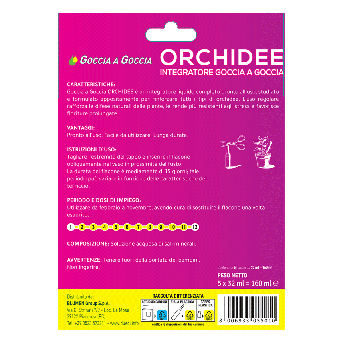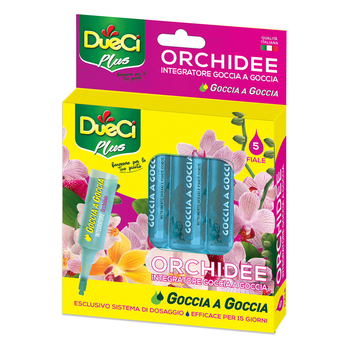 Integratore liquido completo, pronto all’uso, studiato e formulato appositamente per rinforzare tutti i tipi di orchidee. L’uso regolare di Goccia a Goccia orchidee rafforza le† difese naturali delle piante, le rende più resistenti agli stress e favorisce fioriture prolungate.